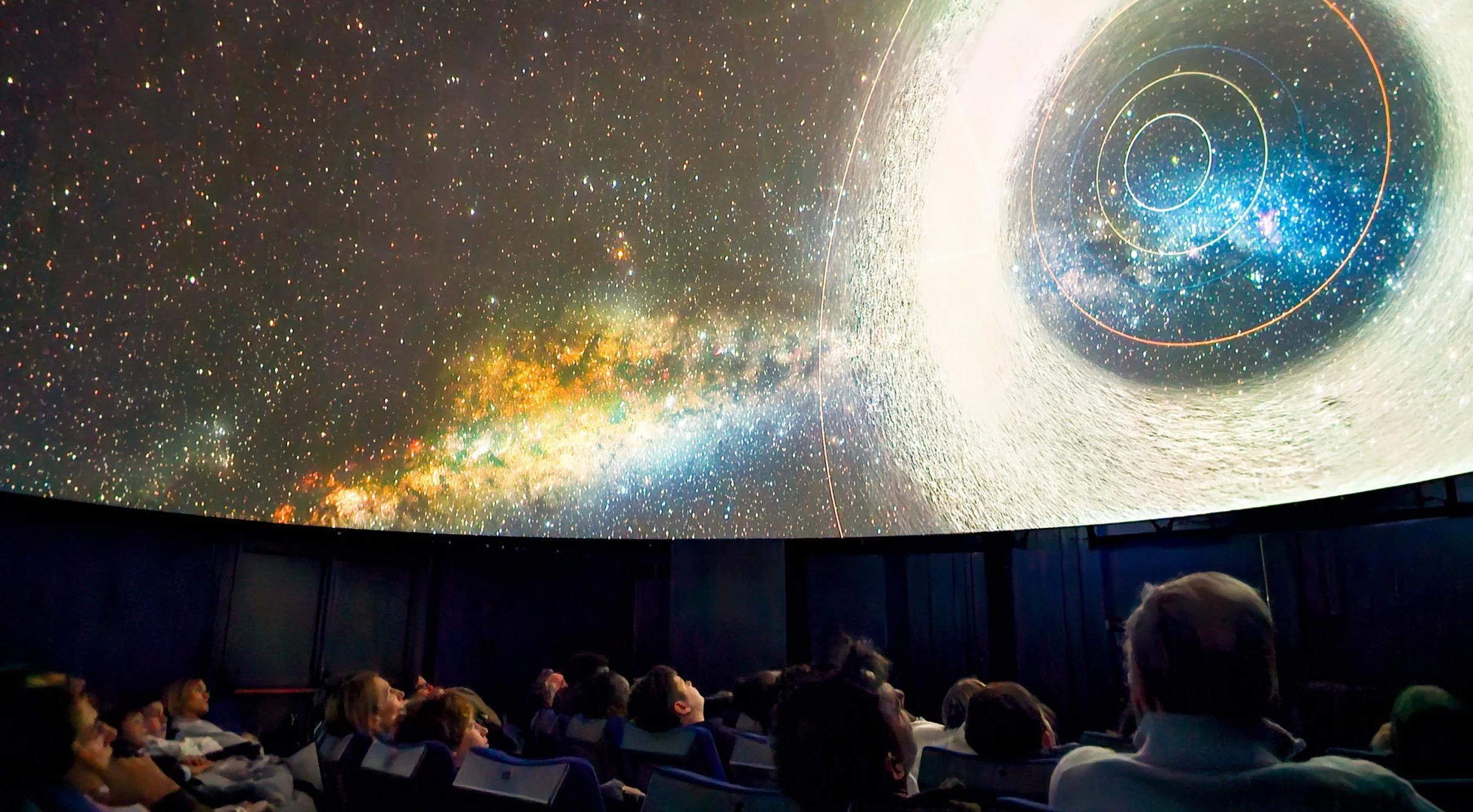 Sotto la grande cupola del Planetario di Padova, i bambini rimangono a bocca aperta: un operatore li accompagna in un viaggio tra costellazioni, pianeti e galassie, proiettati a 360° sul soffitto.